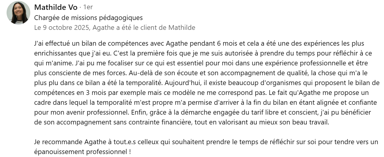 J'offre 1 place par mois à toute personne qui souhaite bénéficier d'un bilan de compétences avec moi à prix libre et conscient. Pour en savoir plus, consulte ma page Tarifs.